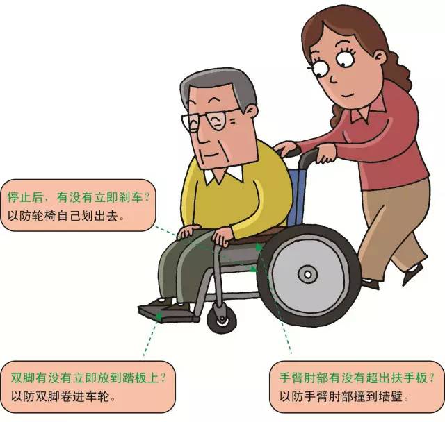 护理的提高:出发时要和患者打好招呼,慢慢地、安静地推动轮椅。